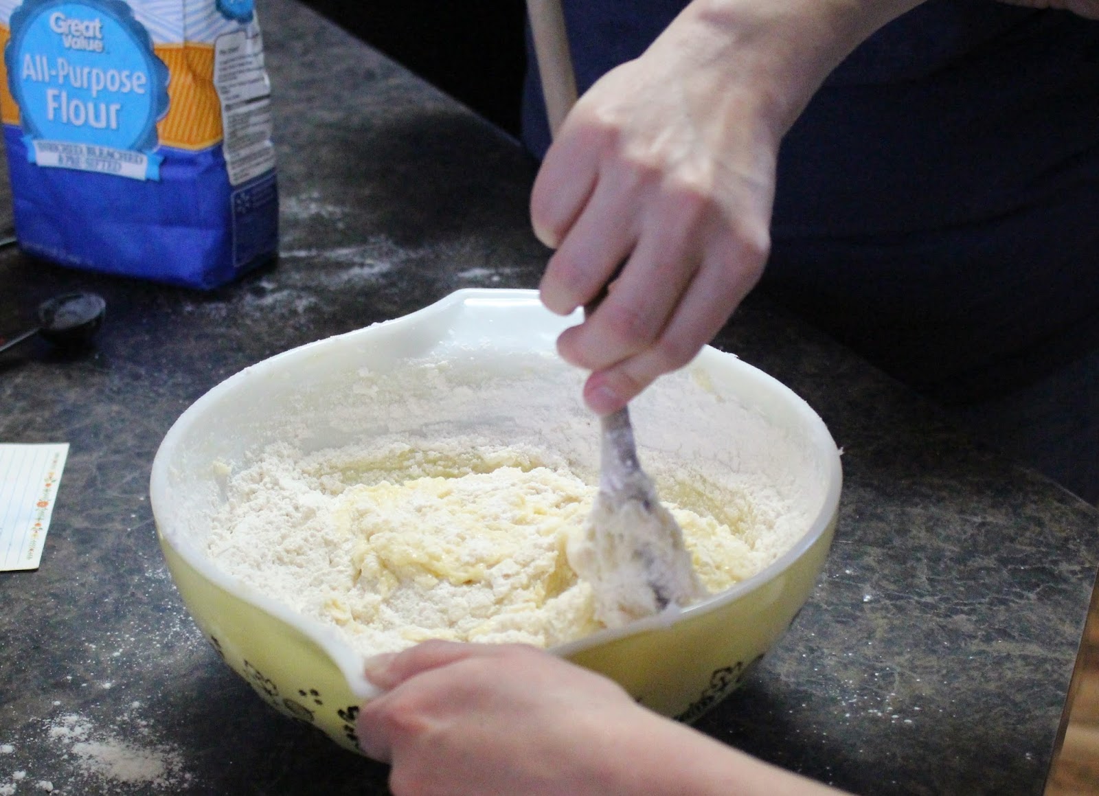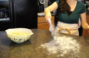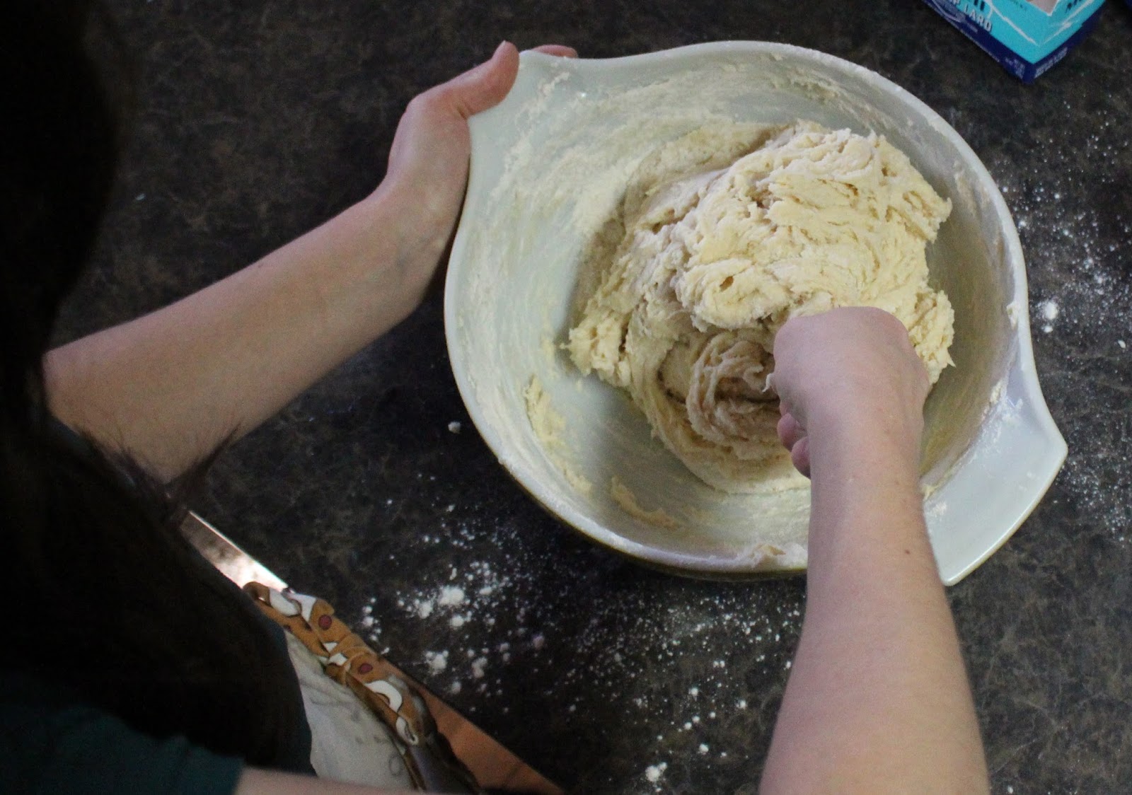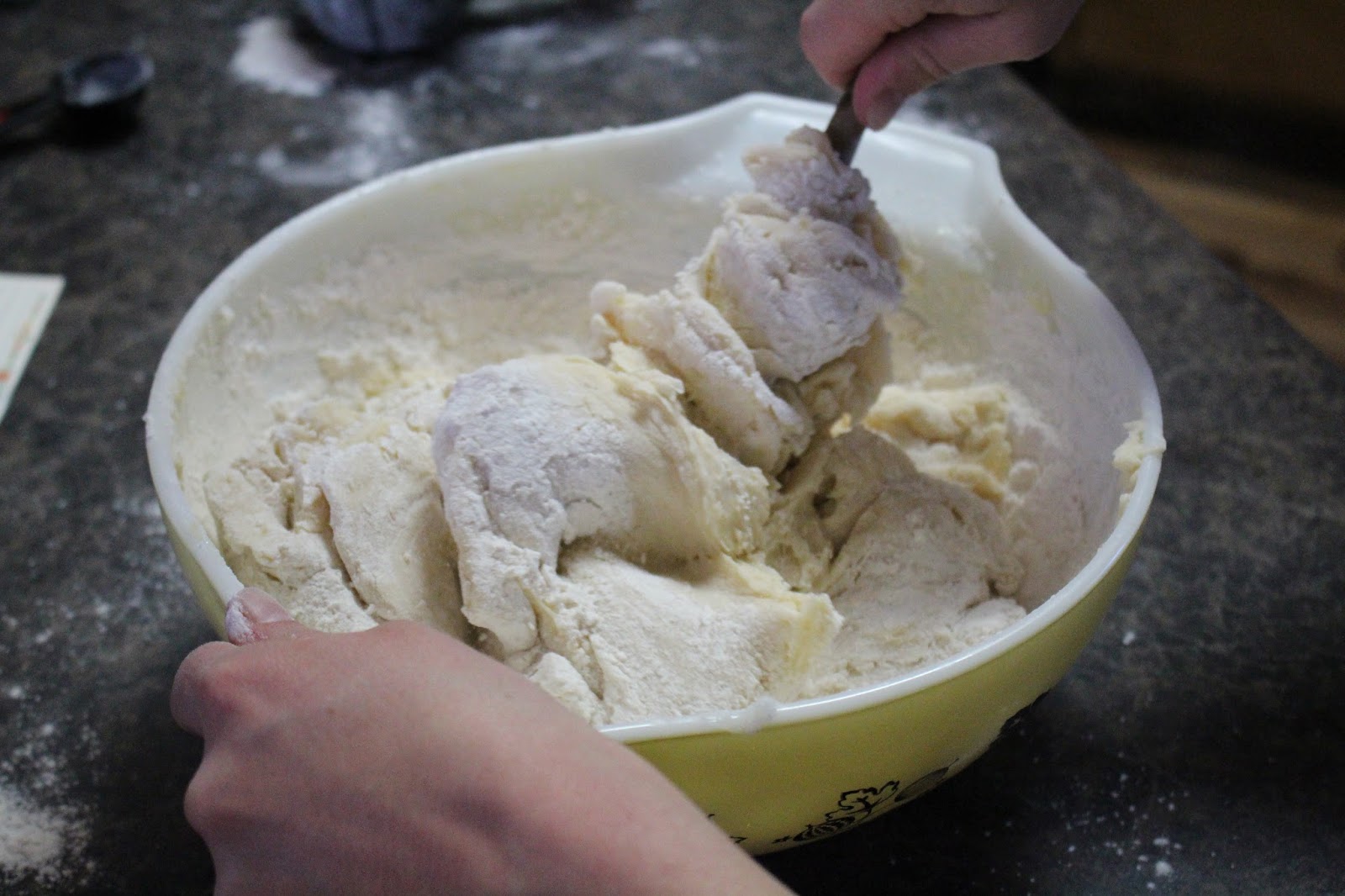 Add 6 cups of flour to the wet mixture one cup at a time.