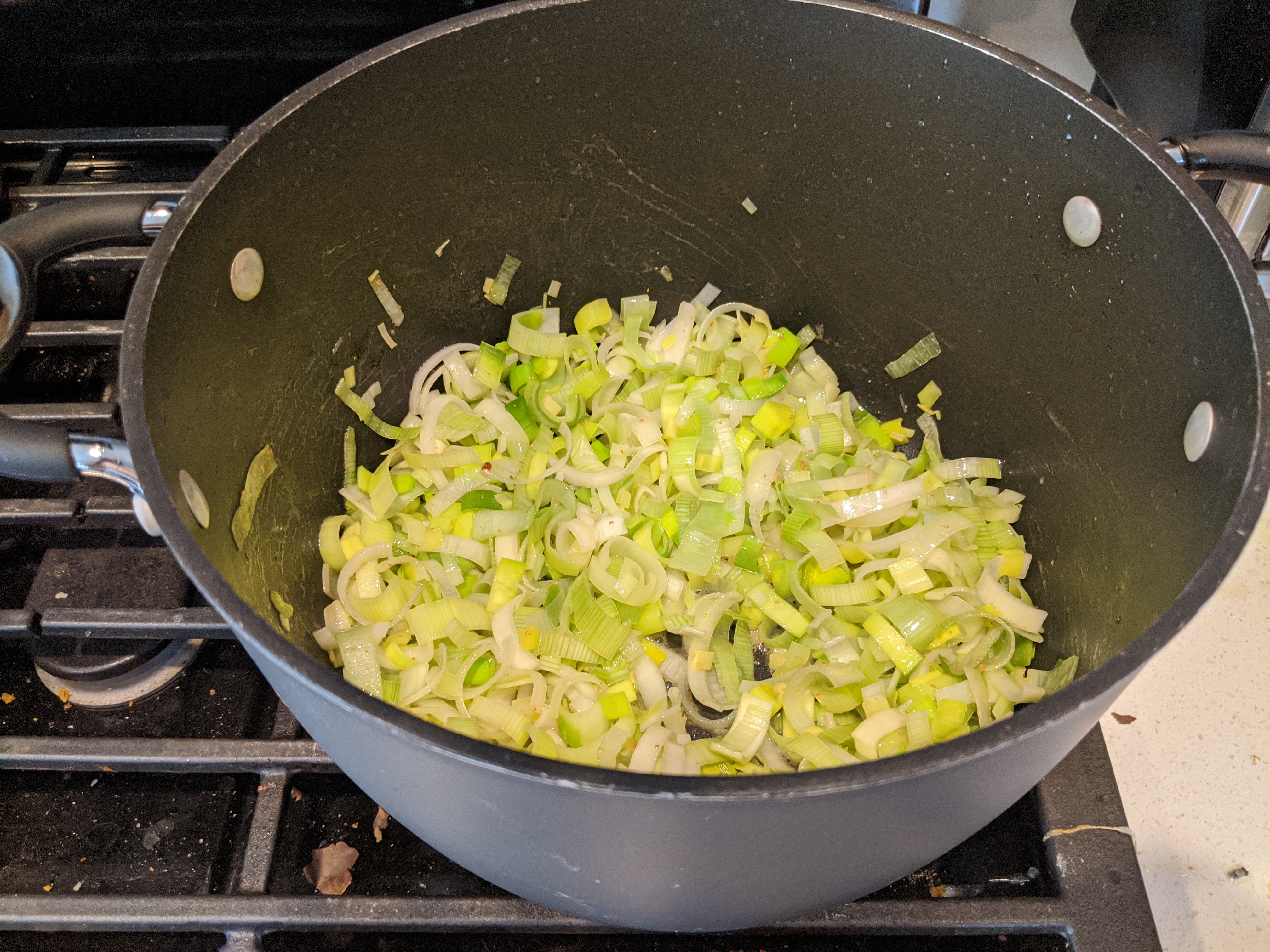 Saute leeks ( in 1Tbl of bacon drippings with a dash of salt) until soft.