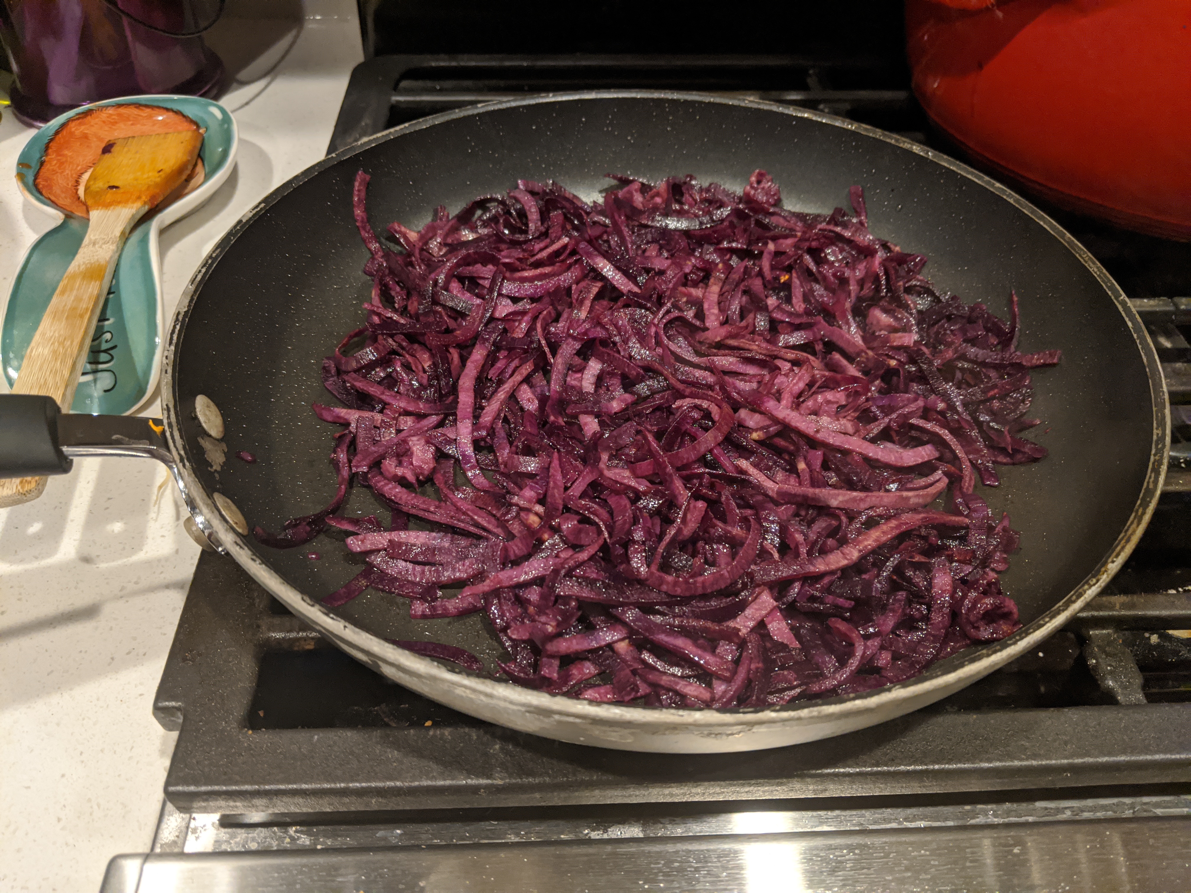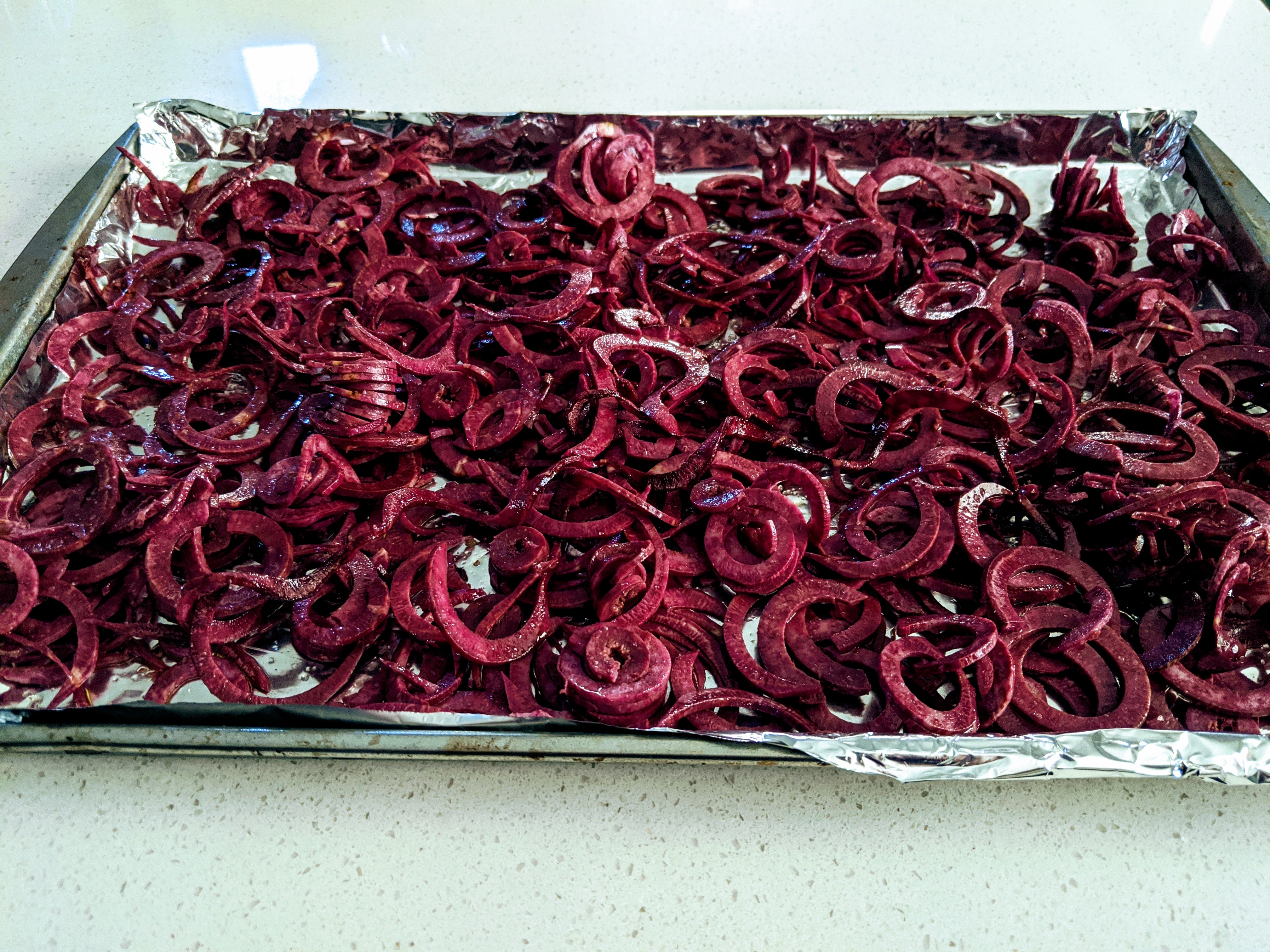 I recently read The Blue Zones Solution – or perhaps more accurately I should say I listened to the audiobook while driving to and from work (I heart audiobooks – they allow this busy Mama to keep up with all the books I don’t have time to sit and read anymore)…but I digress. In The Blue Zones Solution they talk at length about the foods consumed by the world’s longest lived people, and I found myself fascinated by these lists of possible super foods! Among them – the Okinawan purple sweet potato. As though the world knew I had just listened to this amazing book – it delivered these purple beauties to my nearest Sprouts Market and I was able to give them a try. Turns out – they are amazing! Not as sweet as the white and orange varieties of sweet potatoes we see more commonly here in the states – they lend themselves beautifully to pairings with spicy and savory dishes. In particular they are a wonderful substitute for noodles! Thanks to my handy dandy spiralizer (first my hand held model and now this fancy counter top model) I am spiralizing these bad boys up on the regular!
